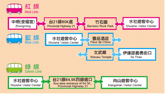 為疏導人潮與車潮,日管處除了將在施放煙火場次的當天下午4:00實施交通管制措施,包括環潭公路二線道禁止停車,四線道開放路邊停車之外,也特別規劃了往返「中明-水社-向山」以及「水社-伊達邵」的紅、藍、綠等三線免費接駁專車,從下午四點開始接駁到散場,提供民眾搭乘。