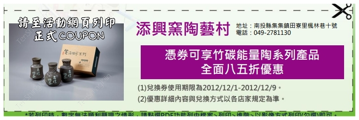 凡持【OTOP DAYs全省聯合促銷活動─COUPON券】至本窯消費,竹碳能量陶系列商品全面八五折。